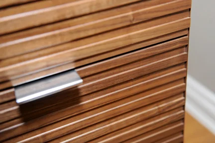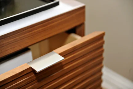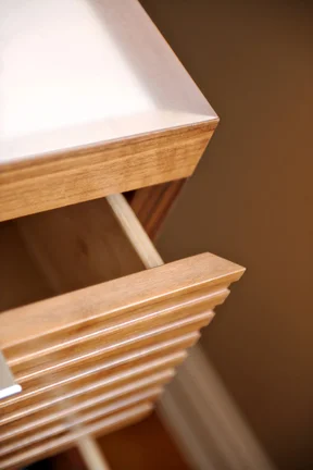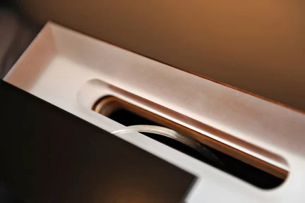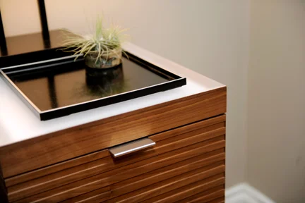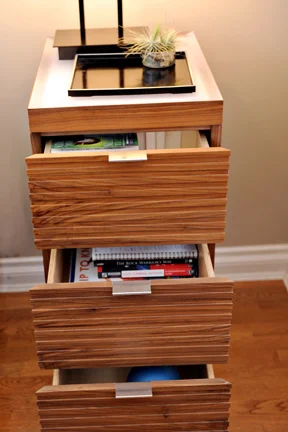 The little brother to Macchiato is 'Macchiato Mini'. These nightstands were also designed by Kori Chan, with similar details to Macchiato. Drawers are on soft-close slides with discreet handles, and wire management is handled through a false back panel and slot in the back of the stand.